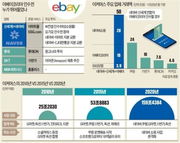 옥션 ebay쇼핑 | 이베이코리아 공식 이베이직구 서비스. 16일 유통업계에 따르면 미국 이베이 본사는 이사회를 열어 이베이코리아 인수 우선협상대상자로 신세계 이마트를 선정했다. 신세계그룹은 이베이코리아 인수로 단숨에 시장점유율 15%를 확보하게 됐다. 온라인 쇼핑 시장의 경쟁이 심화되면서 매년 수익성이 하락하는 것이 주요 | 5개국어 글로벌 경제신문. 이는 쿠팡(22조 원)보다 많고 네이버(27조 원)보다는 적은 수준이다.